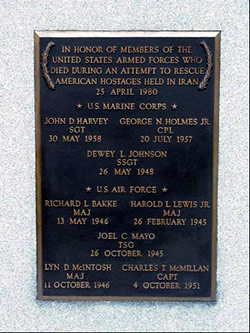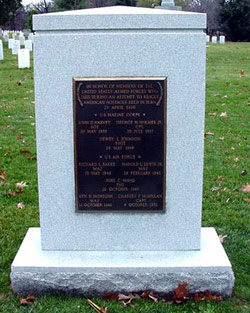 A monument dedicated to the memory of those gallant servicemen, who died in the valiant effort to rescue the American hostages, was erected at Arlington National Cemetery. The white stone marker bears a bronze plaque listing the names